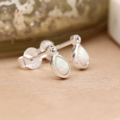 Clustdlysau Styd Arian | Sterling Silver Stud Earrings - Opal and Crystal Teardrop