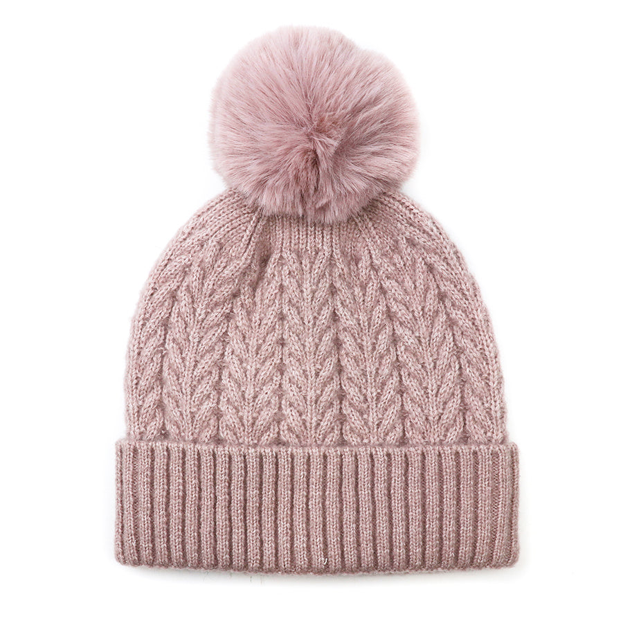 Dusky pink herringbone knit bobble hat made from recycled yarn with ribbed turn up and faux fur pom-pom