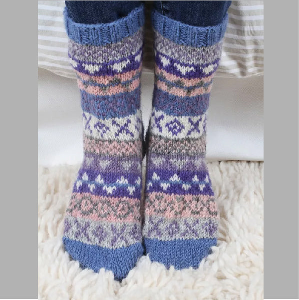 Finisterre - bands of traditional Fair Isle patterns made up of carefully selected colours in a range of simple patterns which may vary from piece to piece. Pachamama sofa socks will keep your feet warm in winter curled up in front of the log burner.