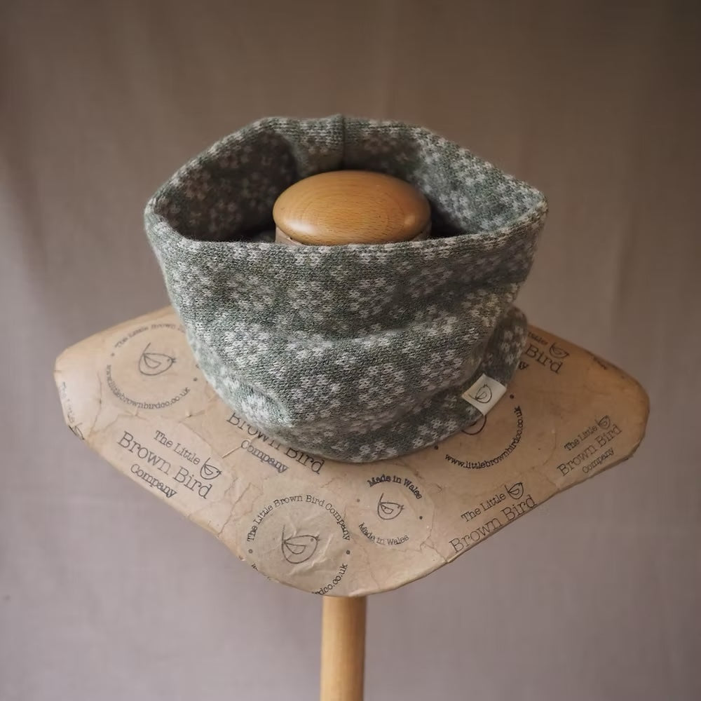 This spectacular snood has been knitted by The Little Brown Bird Company on a domestic punch card knitting machine in their work shop in North Wales. They are knit using 100% Merino wool and are double sided meaning the pattern is knit on the inside as well as the outside, making a thicker fabric that holds its shape more. The pattern was inspired by Welsh textiles and overshot weaving.