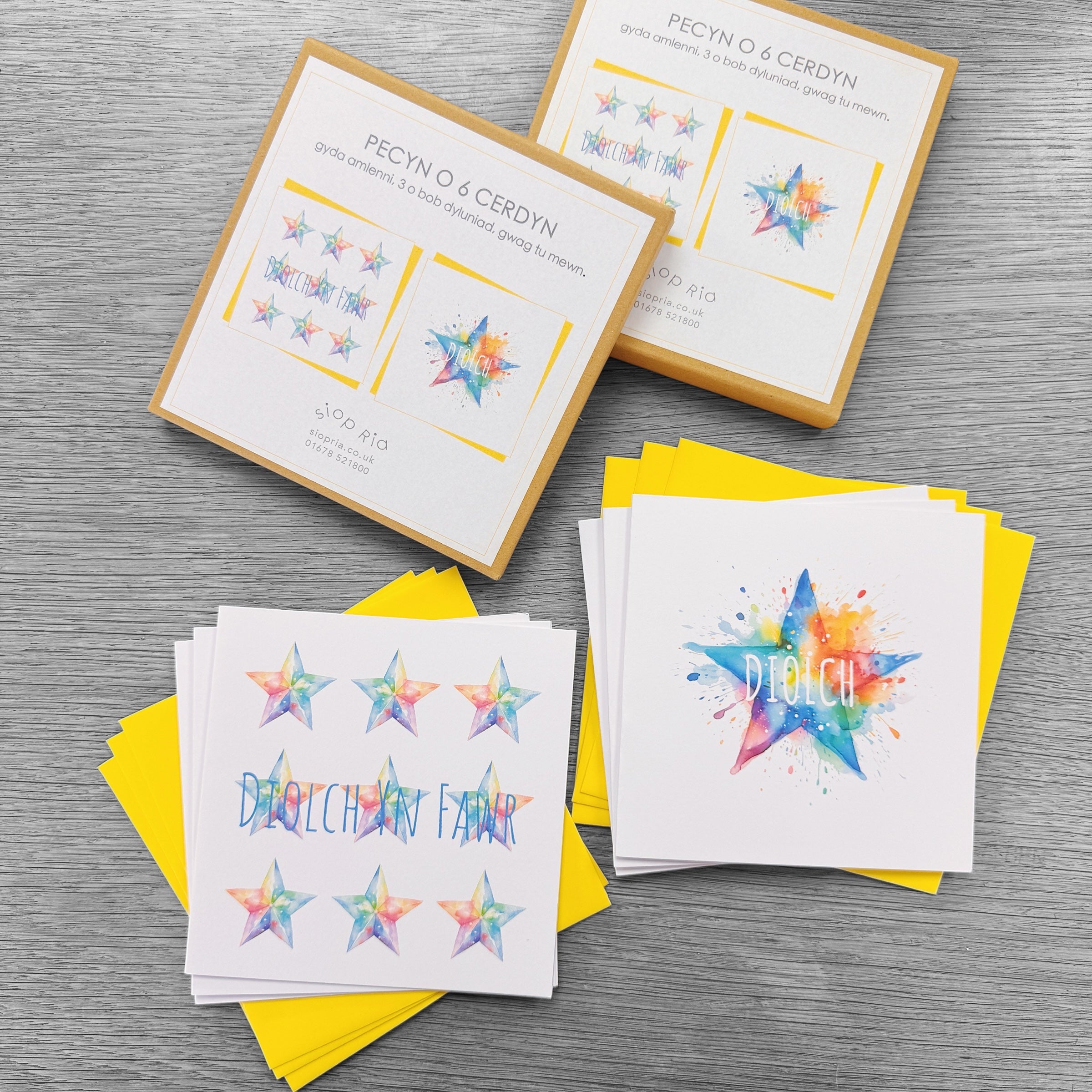 Pecyn o 6 cerdyn "Diolch yn fawr", dau ddyluniad, 3 o bob un.