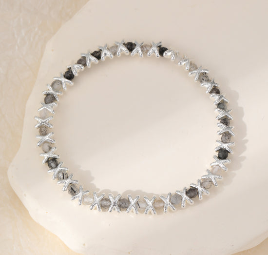 Plated stretch bracelet with cross shaped silver beads with charcoal coloured stone beads.