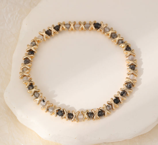 Plated stretch bracelet with cross shaped gold beads with charcoal coloured stone beads.