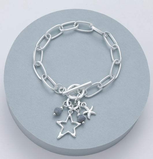 Plated chain bracelet with T bar closure and star charms.