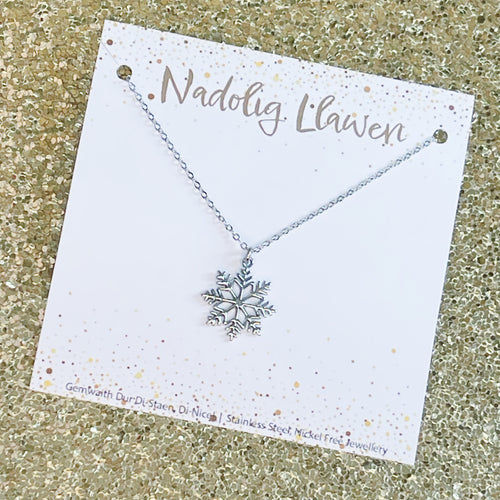 Cadwyn Pluen Eira ar Gerdyn Nadolig Llawen | Carded Snowflake Necklace - Merry Christmas