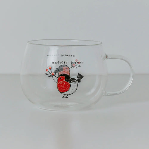 Mwg Gwydr - Robin Goch y Nadolig | Glass Mug - Welsh Christmas Robin