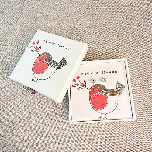 Clustdlysau Hyfryd - Robin Goch y Nadolig | Silver Plated Boxed Earrings - Welsh Christmas Robin