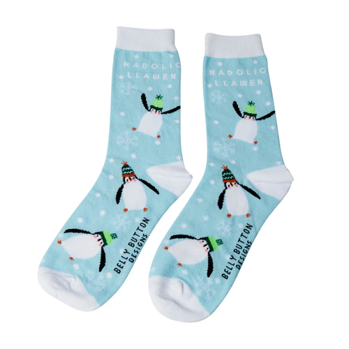 Sanau Nadolig - Pengwin y Nadolig | Belly Button Christmas Socks - Penguins