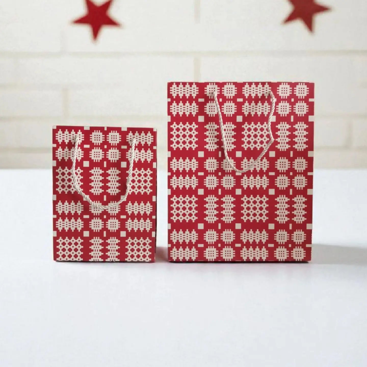 Dathlwch achlysuron arbennig gyda’r bag anrheg patrwm brethyn Cymreig coch hwn, sydd wedi’i ddylunio’n arbennig yng Nghymru.
