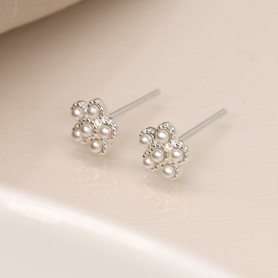 Clustdlysau Styd Arian | Sterling Silver Studs - Faux Pearl Flower