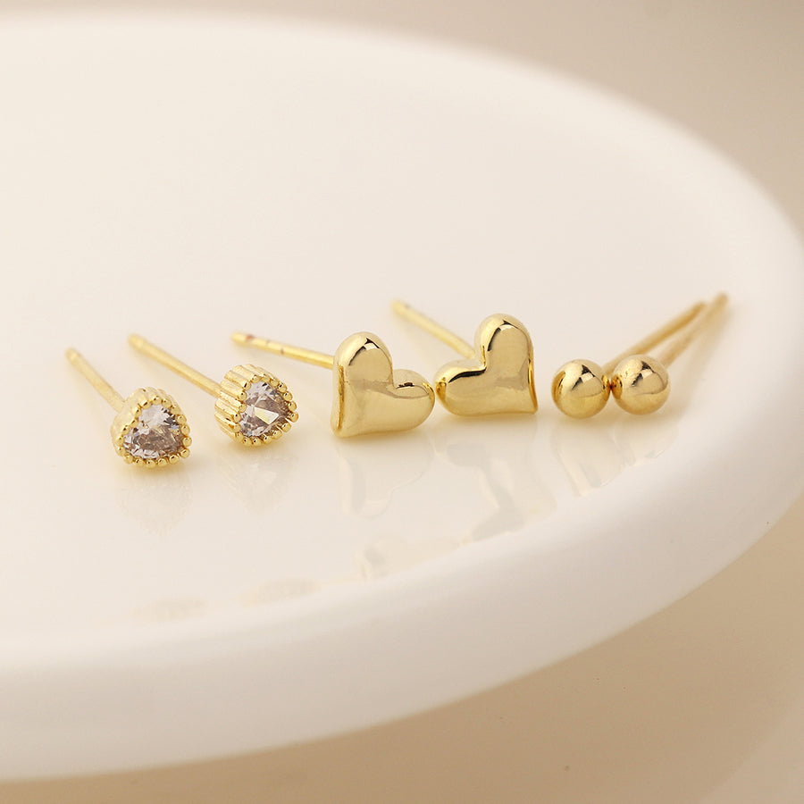 Faux gold plated triple stud earring set with simple bead studs, polished heart studs and decorative crystal heart studs.